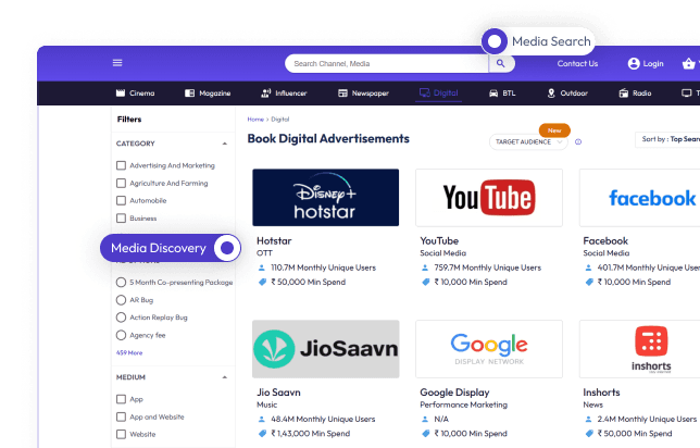 Explore and compare 350K+ media ad options across digital, print, BTL, TV, and more with an intuitive search experience.